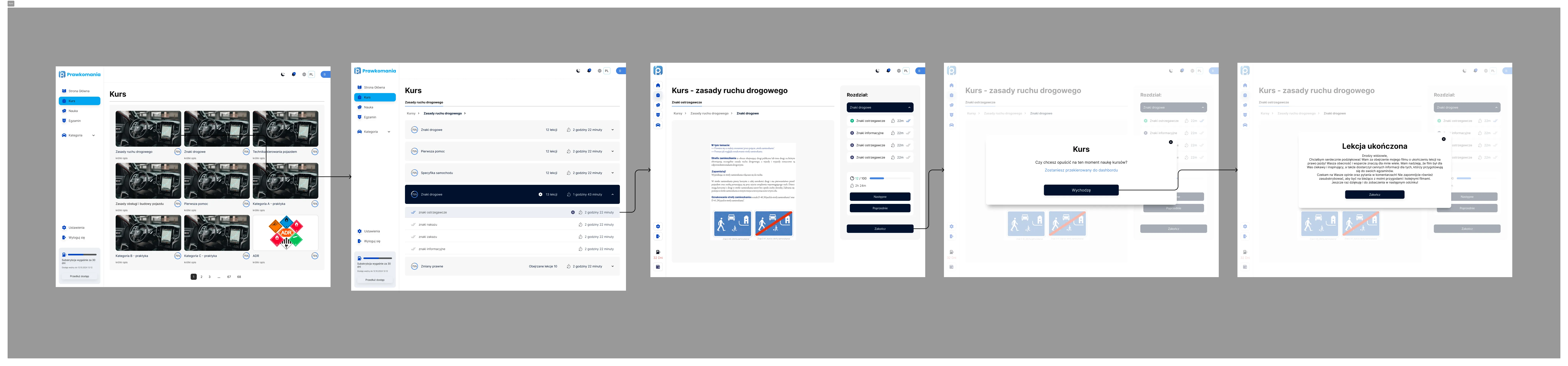 Przejrzysty system projektowy z kolorami nawiązującymi do znaków drogowych, czytelną typografią, ikonografią związaną z ruchem drogowym i intuicyjnymi elementami UI. Komponenty zoptymalizowane pod kątem długotrwałej nauki i koncentracji użytkownika.